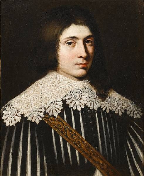 | Portrait of a young man, bust-length, in black and white costume with a lace collar | |