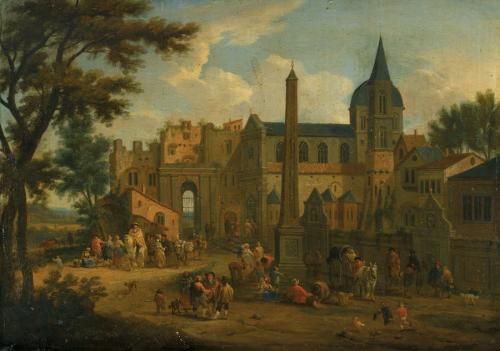 | AN ITALIANATE LANDSCAPE, WITH NUMEROUS FIGURES IN A PIAZZA BEFORE A CHURCH | |