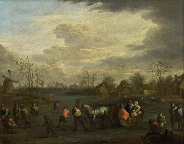 Auf gefrorenem Weiher Schlittschuh laufende und Schlitten fahrende Gesellschaft