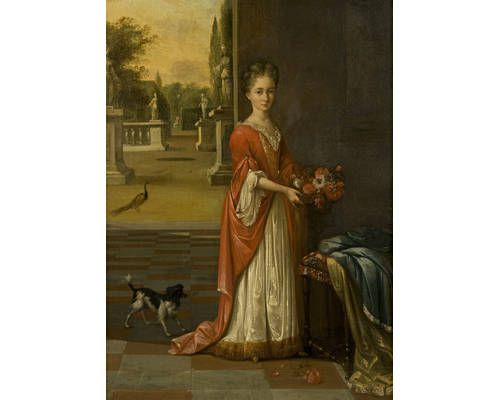 | Portrait of a young girl, full-length, in a white dress and red gown, holding a small basket of flowers, standing before a terra | |