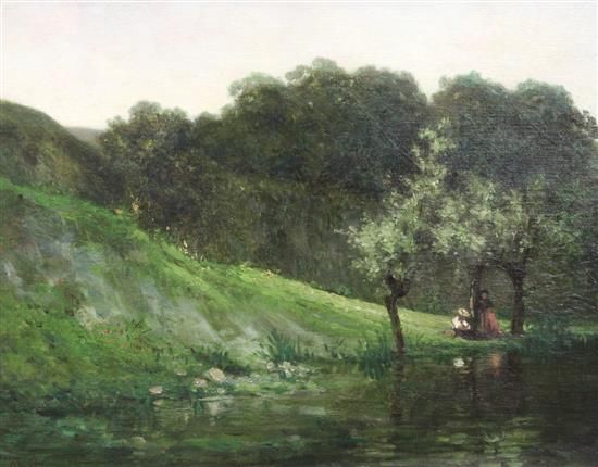 Figures beside a river in a wooded landscape