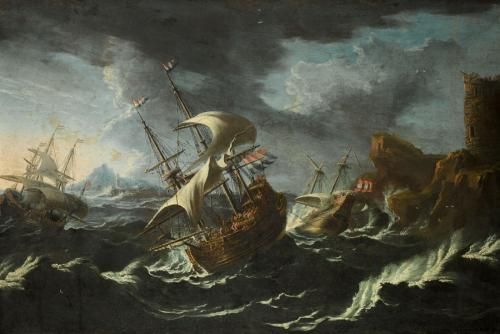 | A STORMY SEASCAPE WITH SHIPPING OFF A ROCKY COAST | |