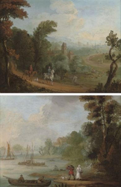 | A wooded landscape with figures on horseback on a track, a town beyond; and A wooded river landscape with figures on the bank, f | |