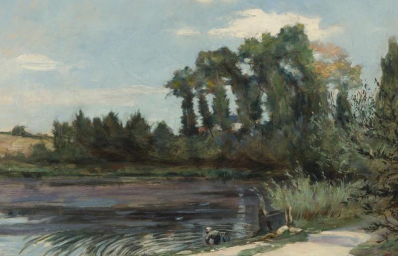 A river landscape with a washerwoman on the bank