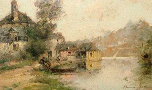 Figures with a boat on a river shore with cottages beyond