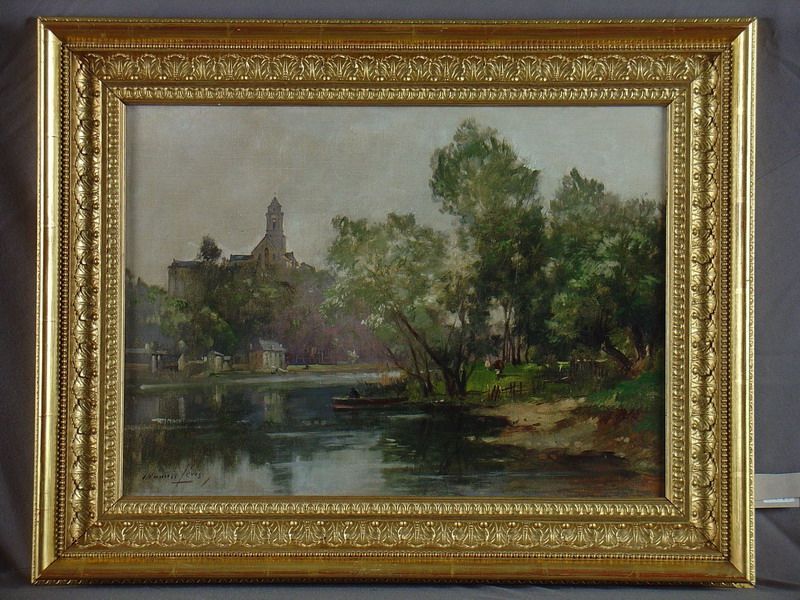 Flusslandschaft mit Kirche über dem Ort und Angler im Kahn
