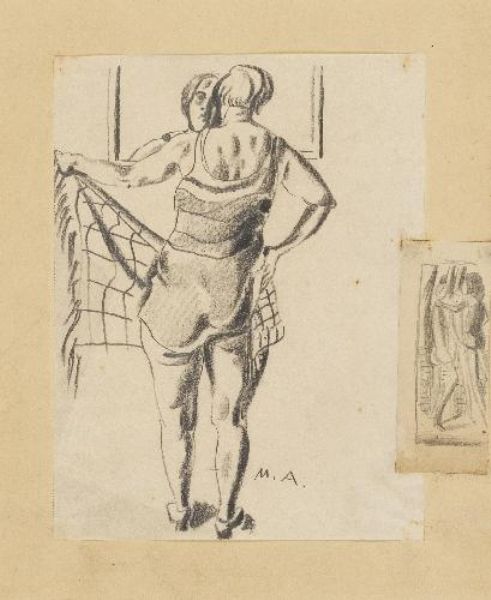 OHNE TITEL (FRAU IM BADEANZUG MIT HANDTUCH VOR SPIEGEL)