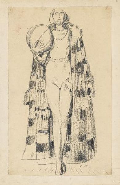 OHNE TITEL (FRAU IM BADEANZUG UND MANTEL MIT BALL)