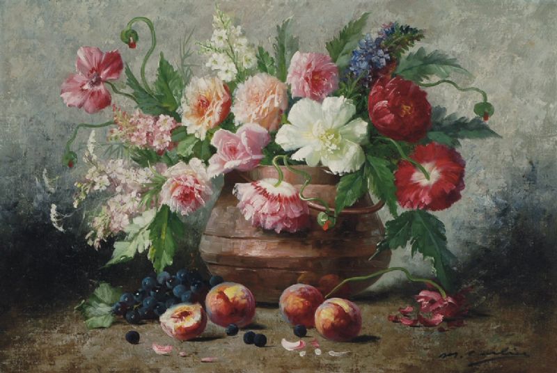 STILLEVEN MET BLOEMEN EN PERZIKEN