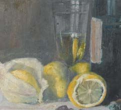 STILLLEBEN MIT ZITRONEN UND WEINGLAS.