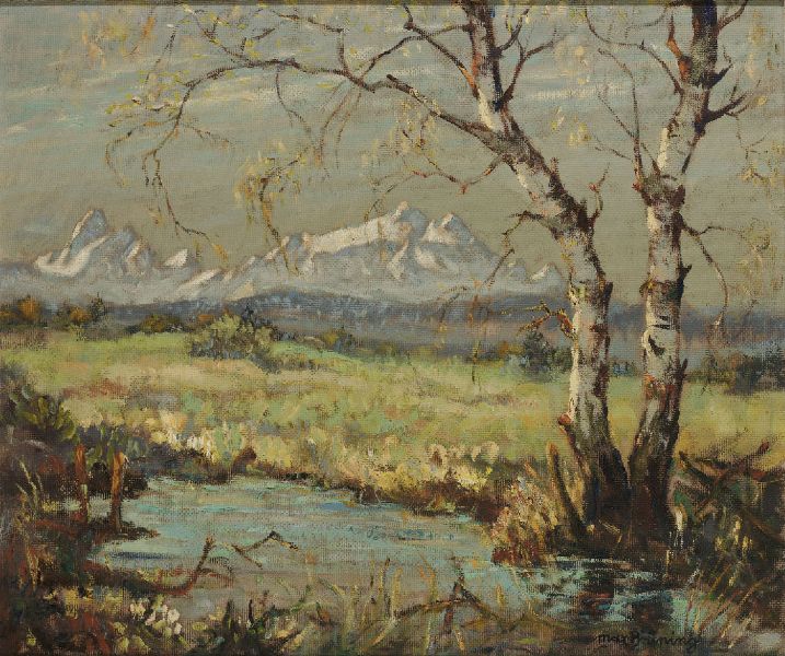Blick über Weiher mit Birke auf Berge, Säntis und Altmann