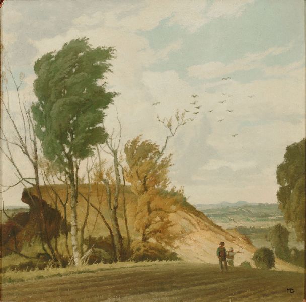 | Hügelige Frühlingslandschaft mit weitem Blick in das Land, im Vordergrund zwei Landarbeiter auf gepflügtem Feld. Stimmungsvolle | |