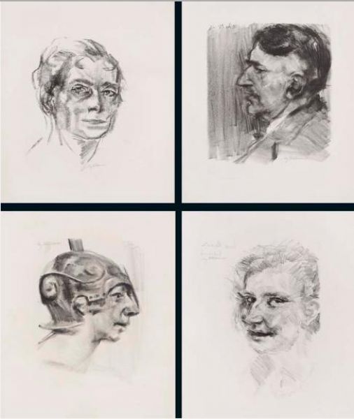 4er Satz Porträt-Lithographien: "Mann mit Helm", "Herren-Porträt im Profil 1928", "Damen-Porträt", "Erna Brandes Palamós (Costa