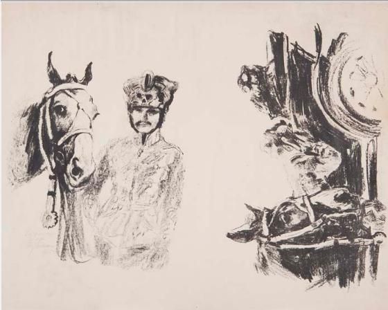 Leibhusar mit Pferd und "Pferdekopf vor Automobil"