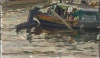 Schiffer auf seinem Boot mit Kajüte auf der Elbe