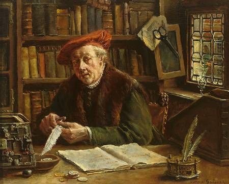 Kaufmann in historischer Tracht spitzt die Feder und zählt die Münzen