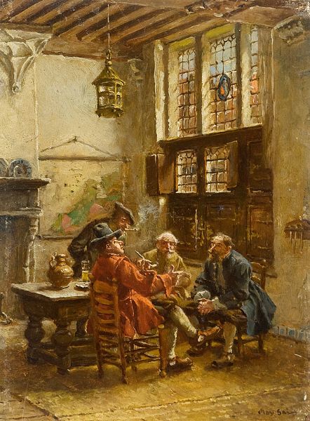 Wirtsstube mit drei, einem Kavalier gebannt zuhörenden Männern, am Schanktisch