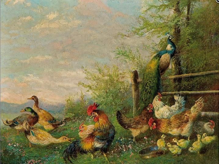 BIRDS ON THE YARD. DUCK, COCK, HENS