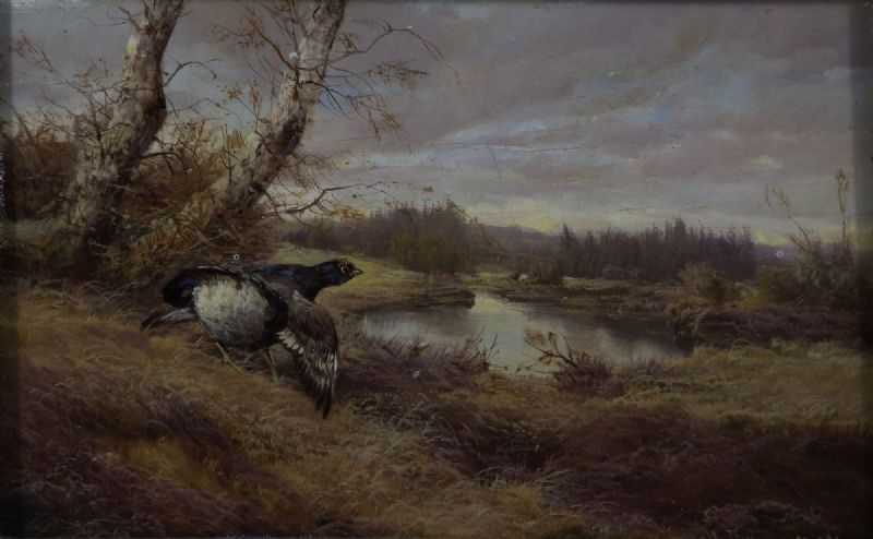 Auerhahn in herbstlicher Landschaft.