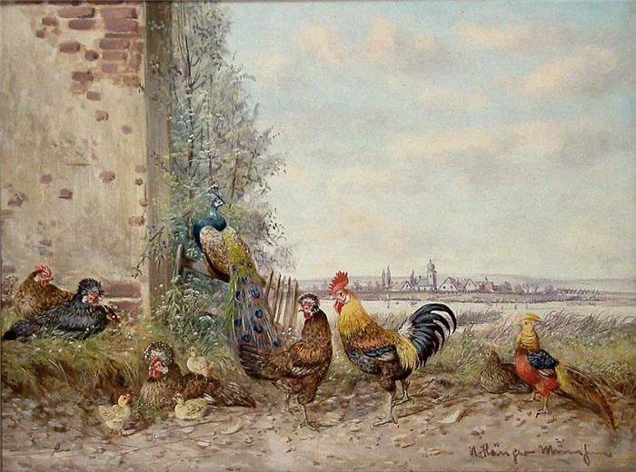 Hühner, Fasan und Pfau am Seeufer, im Hintergrund Dorfansicht