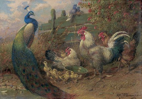 Hühnerhof mit einem Pfau