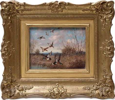Weite, herbstliche Landschaft. An einem Teich acht auffliegende Wildenten