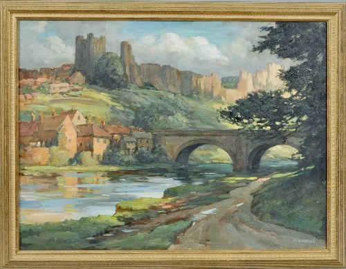 | a Northern riverscape with stone bridge and ruined castle on the hillside | |