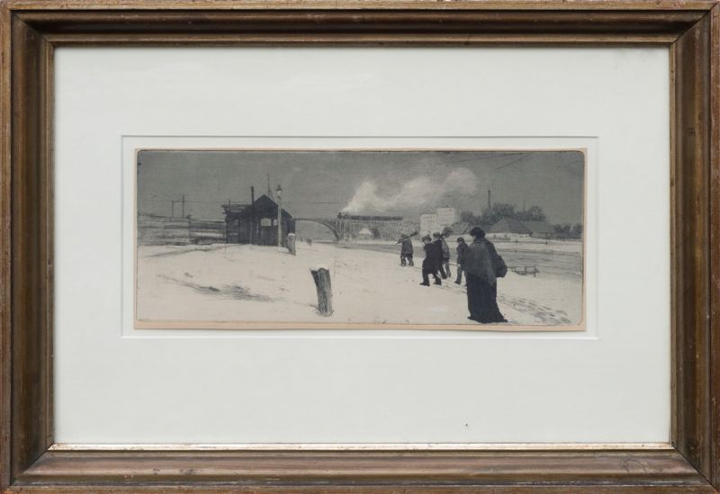 Zimní motiv - postavy na zasněženém břehu řeky, v pozadí železniční most