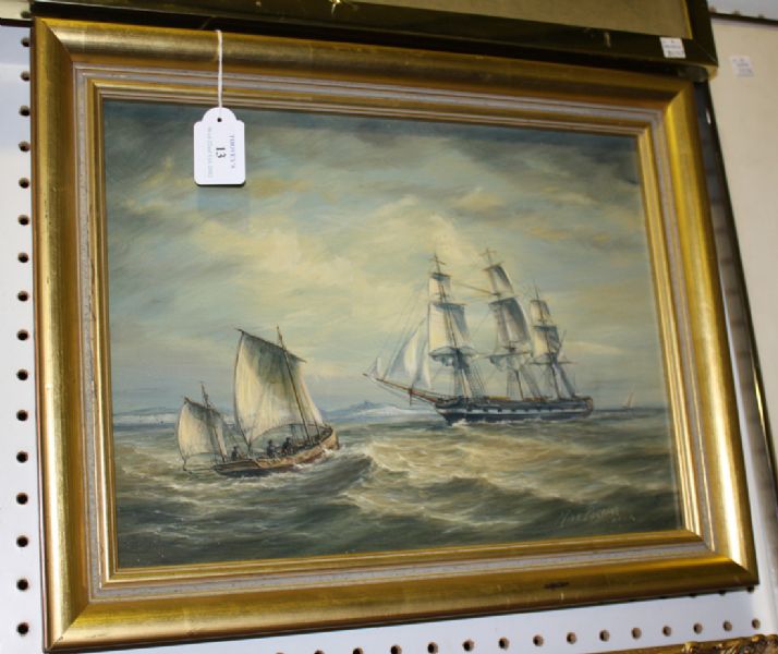 Coastal View with Figures in a Small Sailing Boat heading towards a Man-o'-war