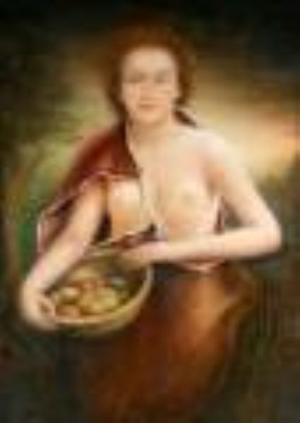 Weiblicher Halbakt mit Fruchtkorb