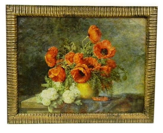 | still life depicting white lilac branches and vermillion poppies spilling over yellow ceramic vase | |