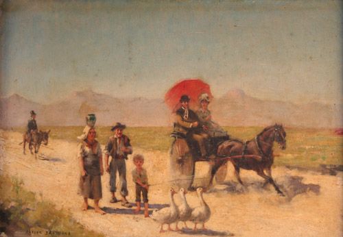 Horse and Trap on a Continental Road passing Figures driving Geese