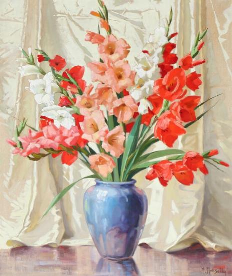 | bouquet with blooming gladiolus flowers in white, pink and red colours | |