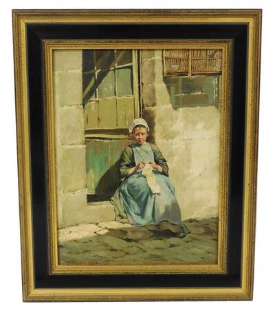 | depicting young woman knitting white garment on sunny threshold in front of divided Dutch door | |