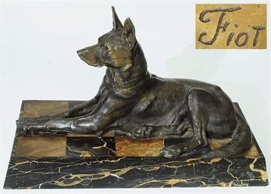 | Alert shepherd dog, presumably bronze aluminum, lying on marble stone base | |