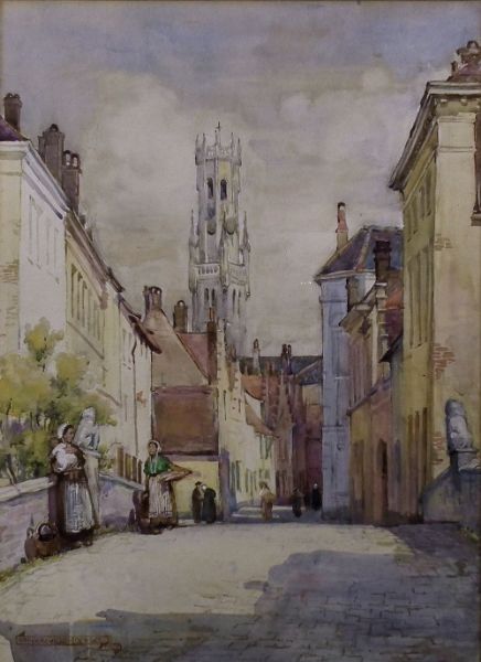 Bruges street scene with figures on a bridge