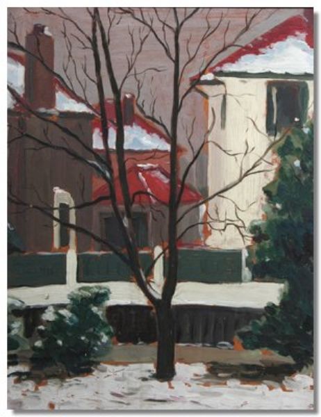 Winter urban scene with red roofed houses