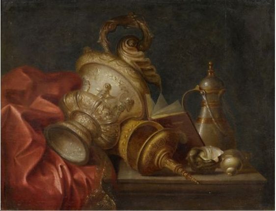 Still life with grandiose silver vases, a book, shells and red drapery on a table.