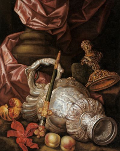Still life with a magnificent silver vessel, peaches, and a pomegranate