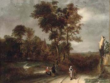 A wooded landscape with figures on a track
