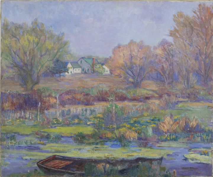 SPRING LANDSCAPE WITH HOUSE OVERLOOKING A STREAM.