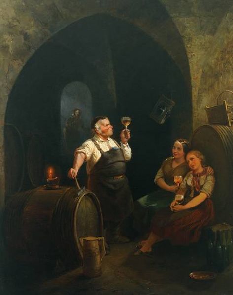 Kellermeister und zwei beseelte Mädchen bei der Weinprobe