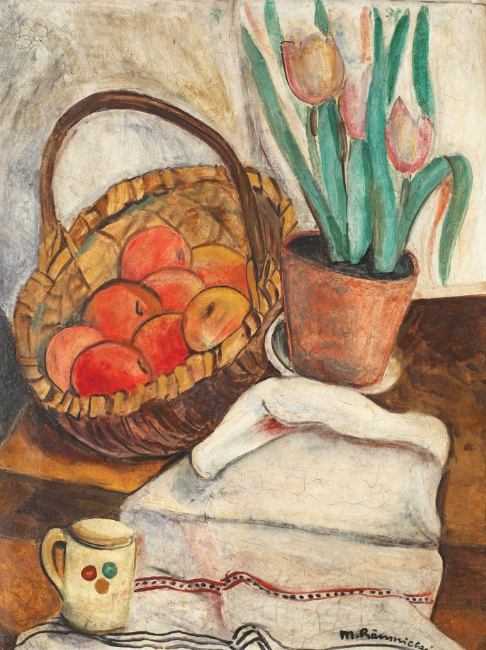 Natură statică cu lalele şi coş cu mere