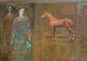 Two standing figures with a horse