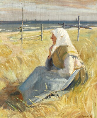 | A woman from Skagen sitting in the lyme grass overlooking the sea | |