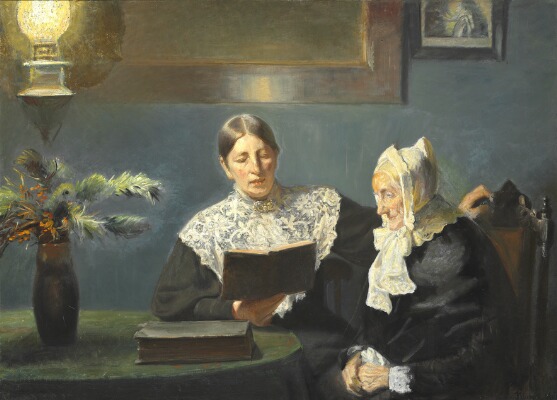 Interiør med Anna Ancher der læser højt for fru Brøndum