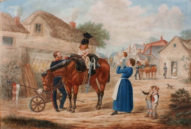 Village scene with military personnel, a young child seated upon a horse