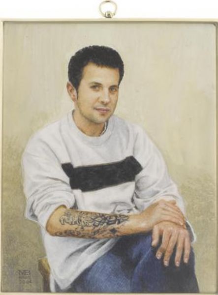 A Young Man, seated and wearing jeans and white sweatshirt.