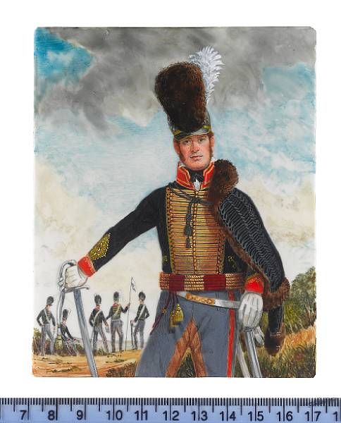 An Officer, wearing blue coat with gold lace, crimson and gold corded sash
