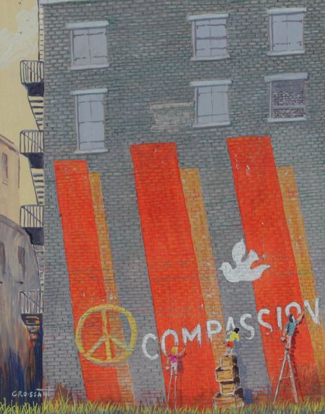 Urban Brick Building with Mural Painters Painting a Sign which Reads ''Compassion'